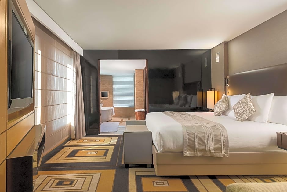 90 sq. m. suite, Executive Lounge access, separate living room, complimentary breakfast, TV. Make yourself at home in this large deluxe suite with marble bathroom, rain shower and deep bathtub. This room features access to the Executive Lounge, offering drinks and evening cocktails. Relax on the sofa and watch the 55-inch TV, or keep in touch with friends, family and work using WiFi. Keep your suite tidy and organized using the large walk-in closet.